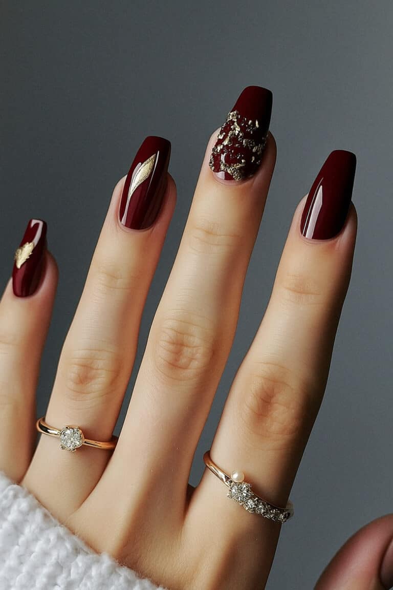 The rich burgundy polish is already giving designer vibes, but the gold leaf accents take it to a whole new level of luxe.