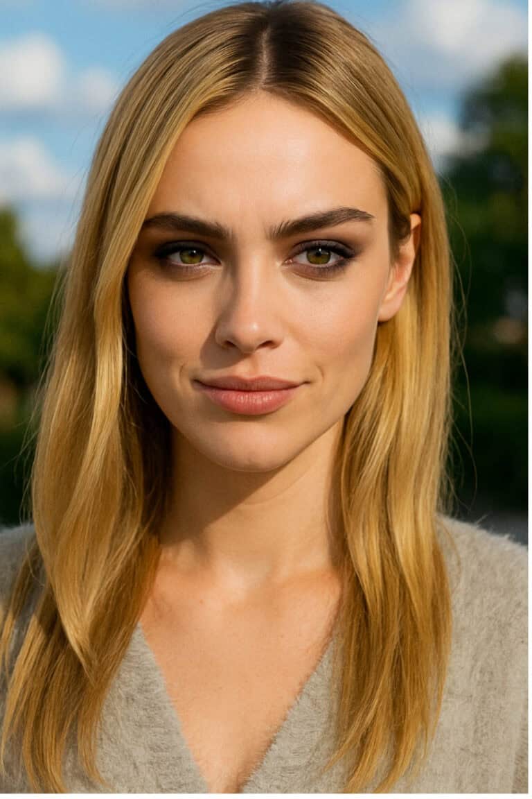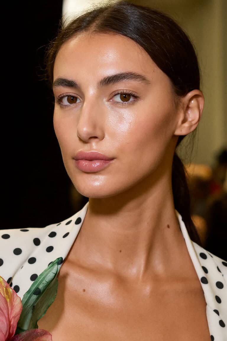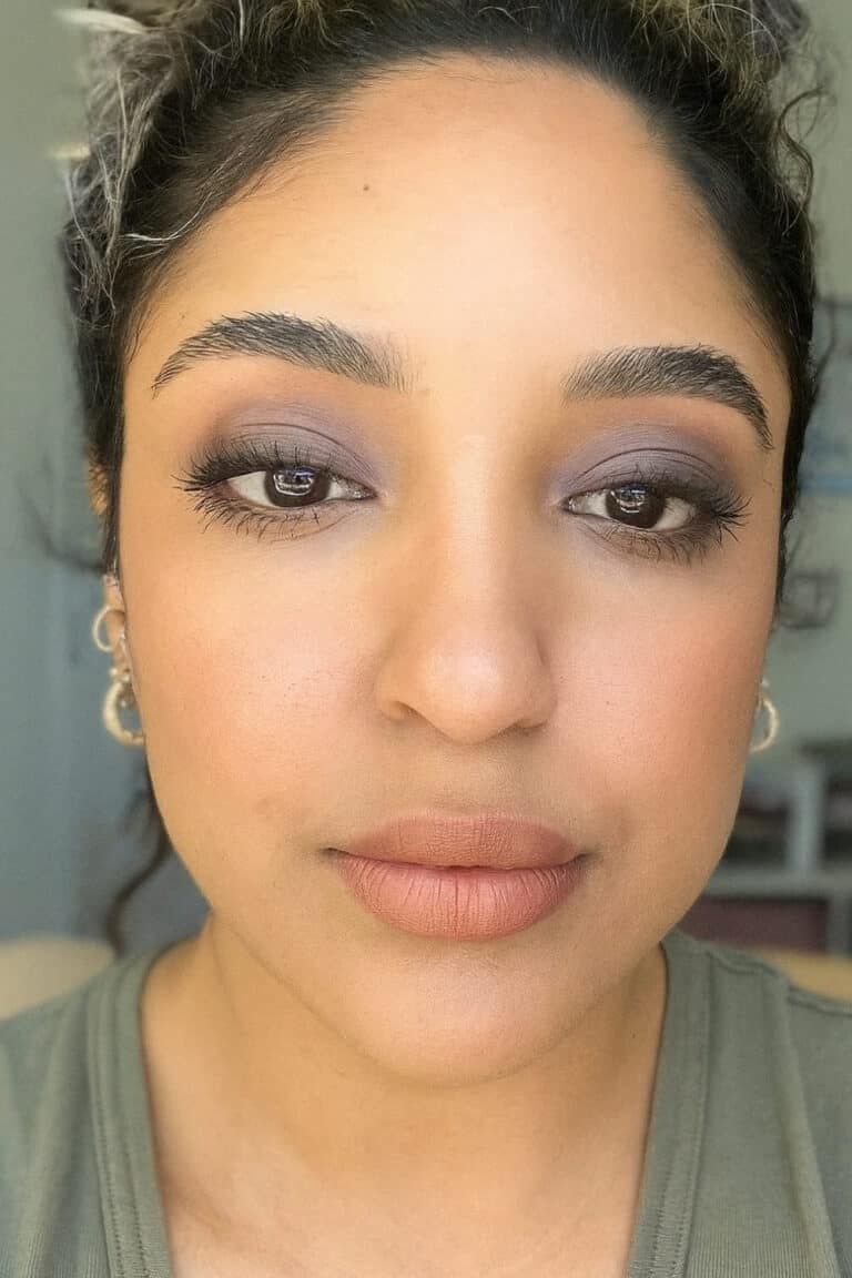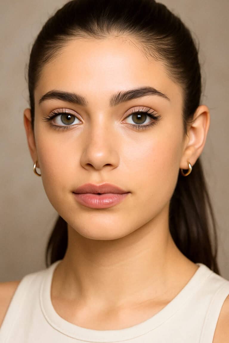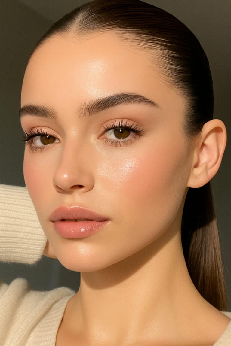 Think diffused matte eyes in warm taupe, a subtle contour to shape things up, and a hint of glow peeking through your base so it never looks flat.