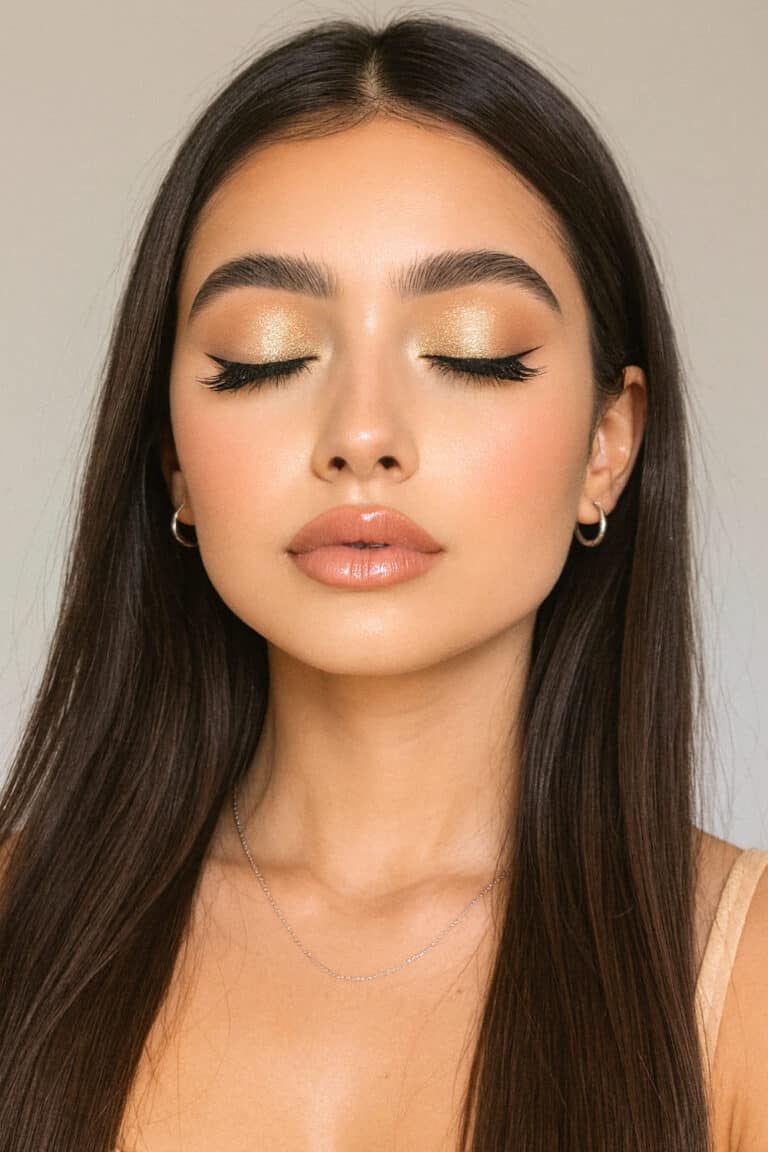 A soft sweep of caramel on the lids with a hint of peach on the cheeks gives off that “just got back from a fall picnic” kind of vibe, especially when you pair it with a glossy nude lip.