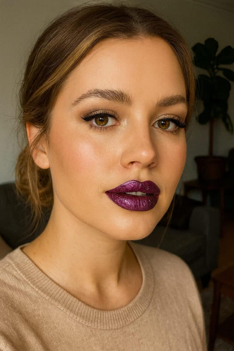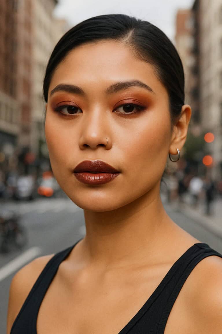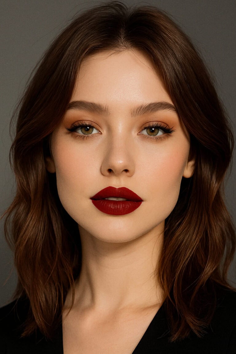 Deep wine, oxblood, or burgundy shades bring instant drama without needing much else on the face.