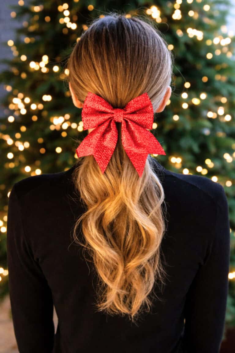 This look is a low, softly waved ponytail finished with a bold red bow, and it’s giving classic Christmas with a polished twist.