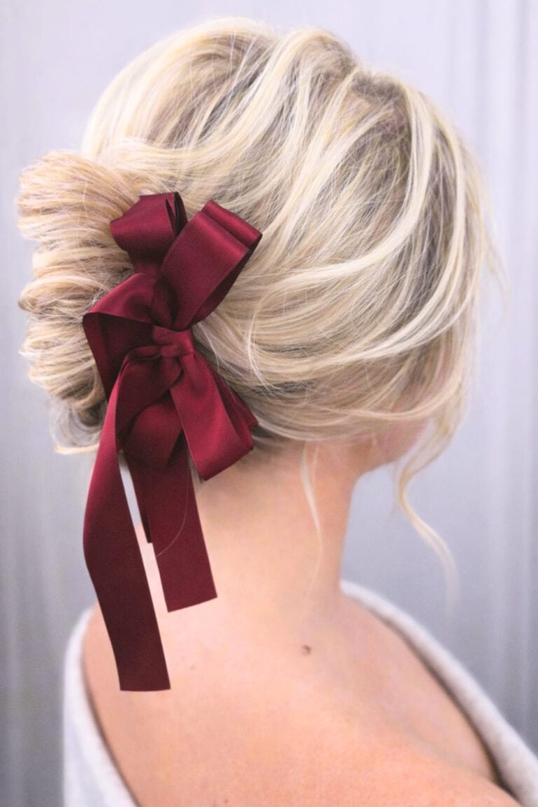 This hairstyle is a soft, slightly messy low bun with loose pieces framing the face, finished with a long satin bow that instantly makes it holiday-ready.