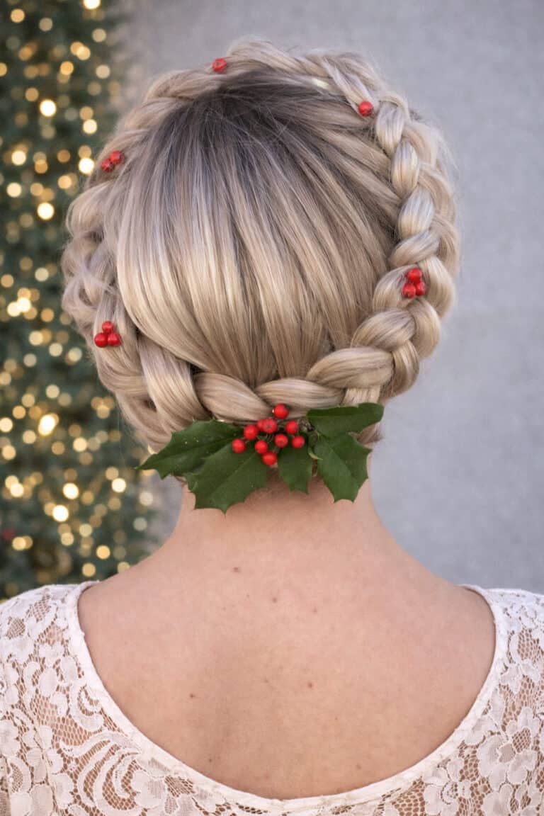 The tiny red berry details woven into the braids and the holly accent at the nape give it that straight-up Christmas magic without feeling over the top.