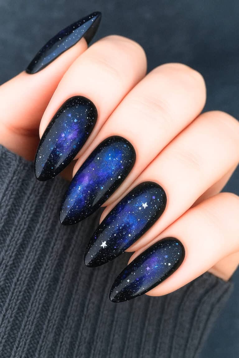 Use a black or navy base. Sponge on purple, blue, and white polish in random patches. Add tiny stars or glitter and seal it all in. Each nail looks like a tiny piece of the universe.