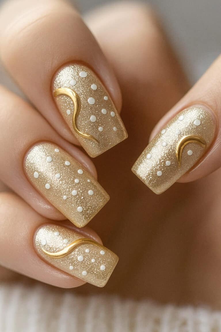 Use a gold shimmer polish as your base. Add small white dots for “bubbles” and use a metallic gold tip or swirl accent. Top it off with high-gloss top coat to make it pop.