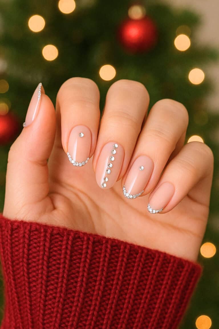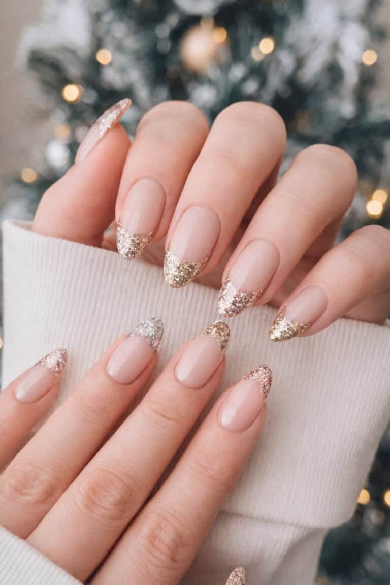 Pick a soft pink or beige base. Use a sponge to dab glitter polish just on the tips and blend down slightly. It’s wearable, pretty, and still NYE-ready.
