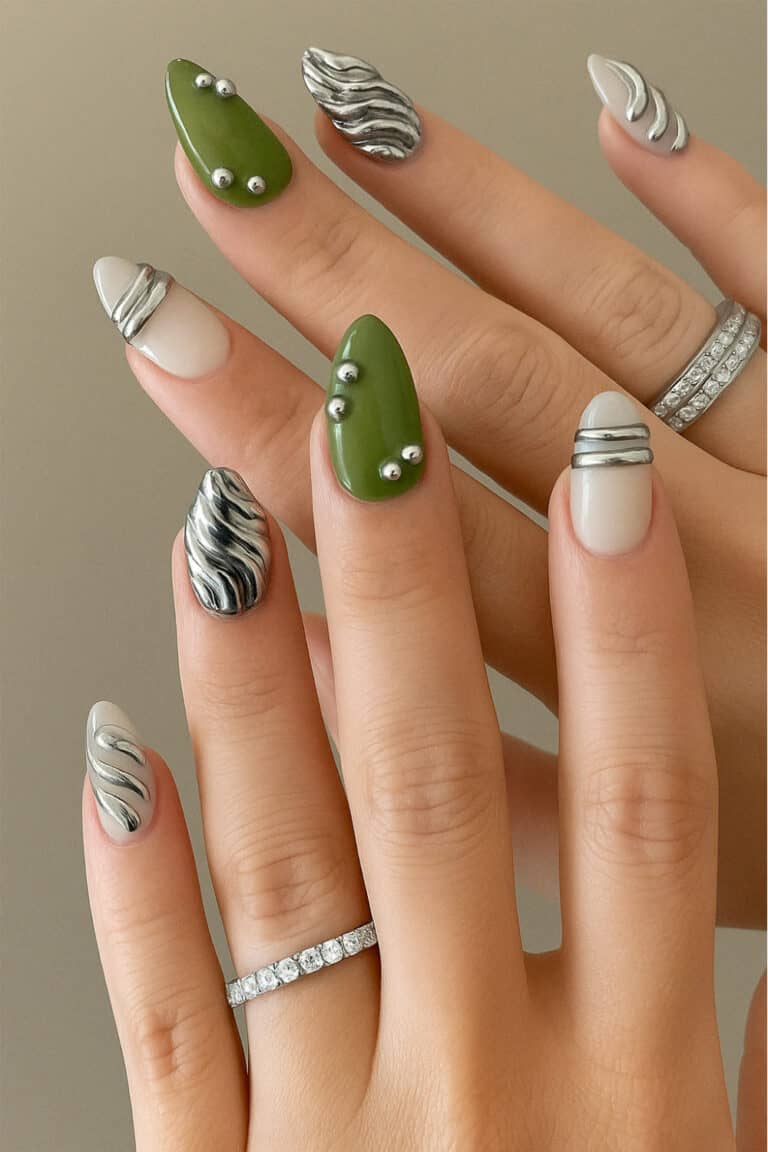 The mix of metallic swirls and bold olive green gives major high-fashion energy, and those silver 3D accents? So sleek.