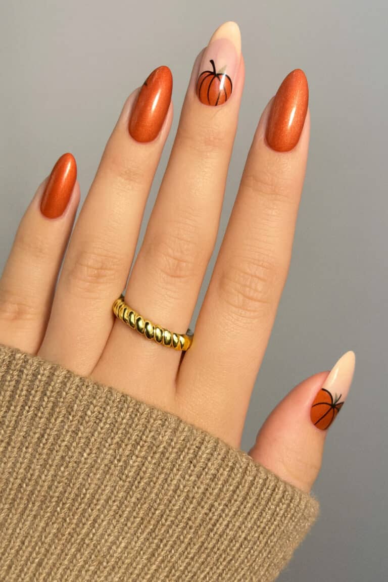 That burnt orange shimmer is totally pumpkin spice coded, and the tiny pumpkin nail art? Literal fall-core perfection.