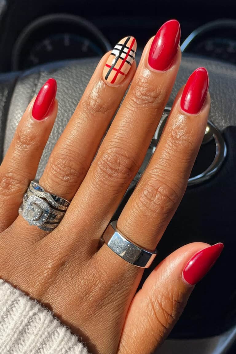 The deep red polish is bold and confident, while that plaid accent nail totally steals the show — classic, preppy, and fall-coded.