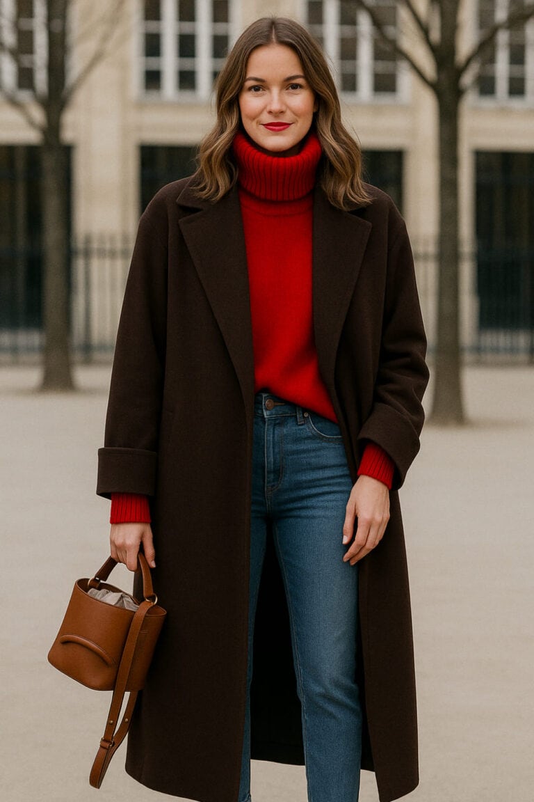 You’ve got that rich brown long coat layered over a bold red turtleneck, and the color combo? Chef’s kiss.
