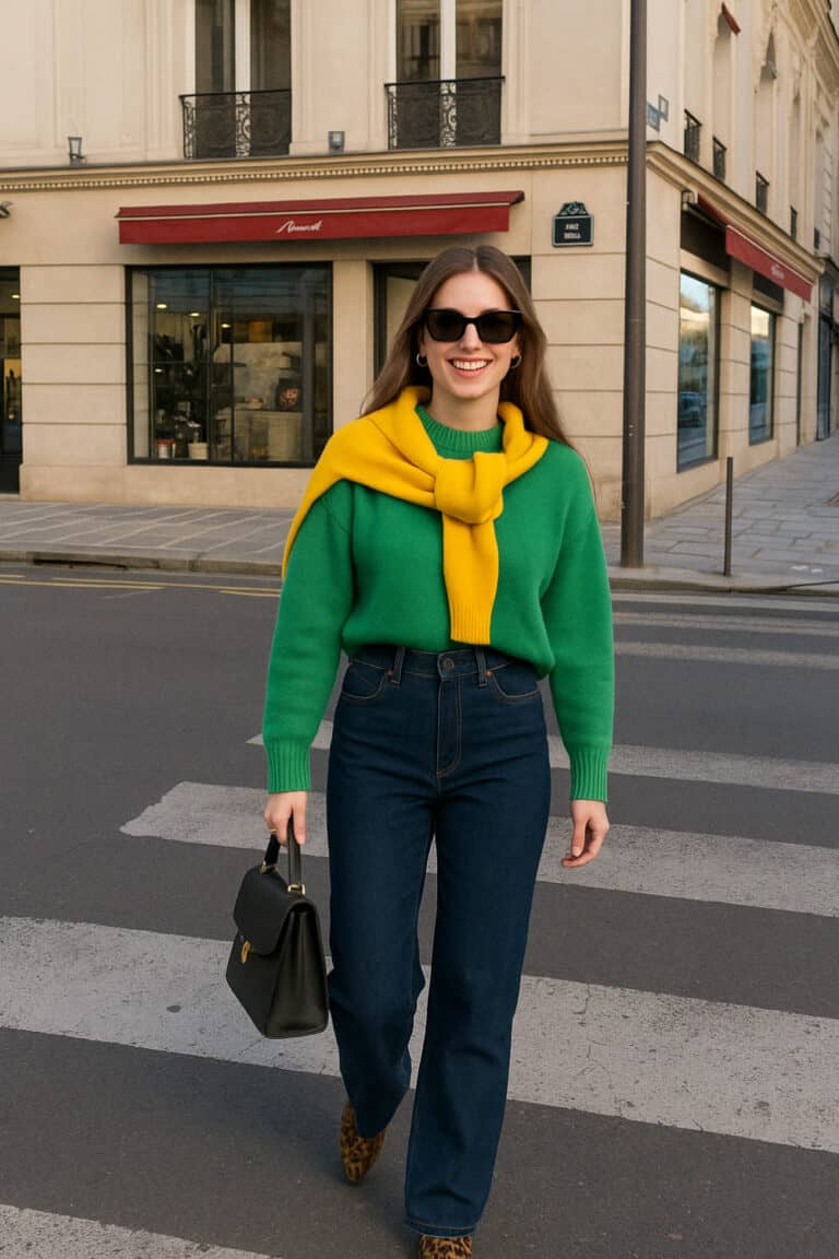 The green sweater paired with a pop of yellow draped over the shoulders gives total “fall, but make it fun” energy.