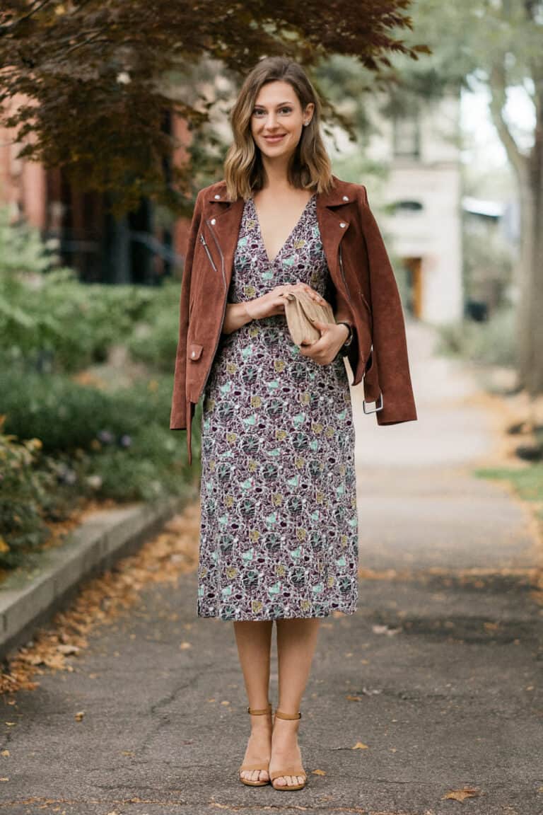 The muted purple and green tones keep it perfectly seasonal, while the suede jacket on top adds that cool, effortless edge.