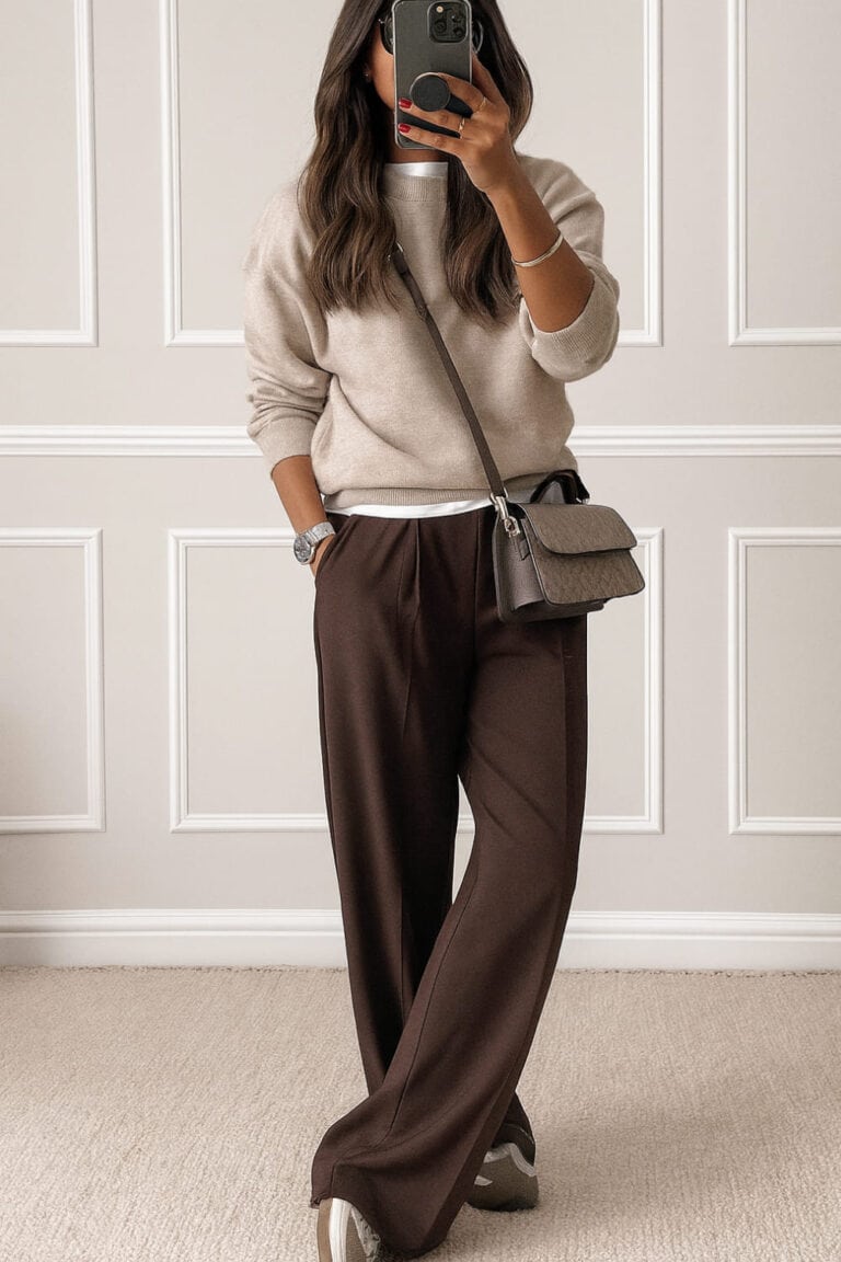 The soft beige sweater tucked into those rich chocolate brown trousers gives total clean-girl energy — cozy, effortless, and elevated all at once.