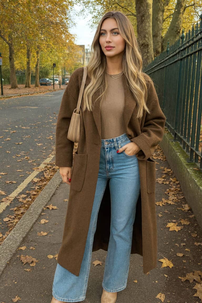 The light wash jeans add just the right amount of contrast against the long brown coat and ribbed top, making it the kind of outfit that looks effortless but still turns heads.