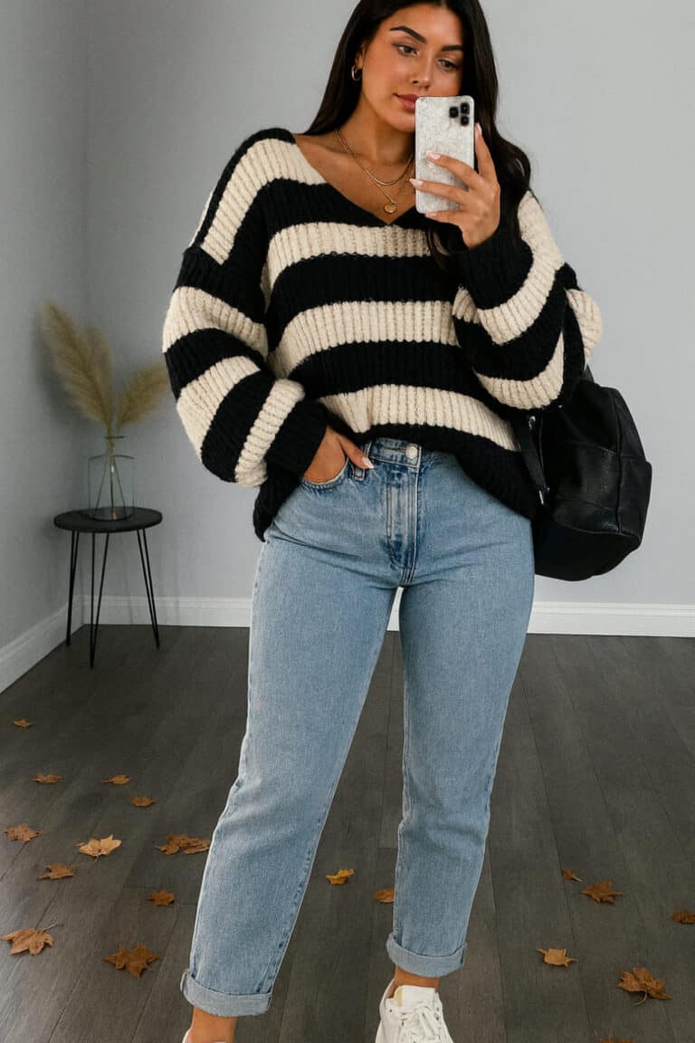 This striped sweater look is such a vibe — cozy, casual, but still giving that clean-girl energy.