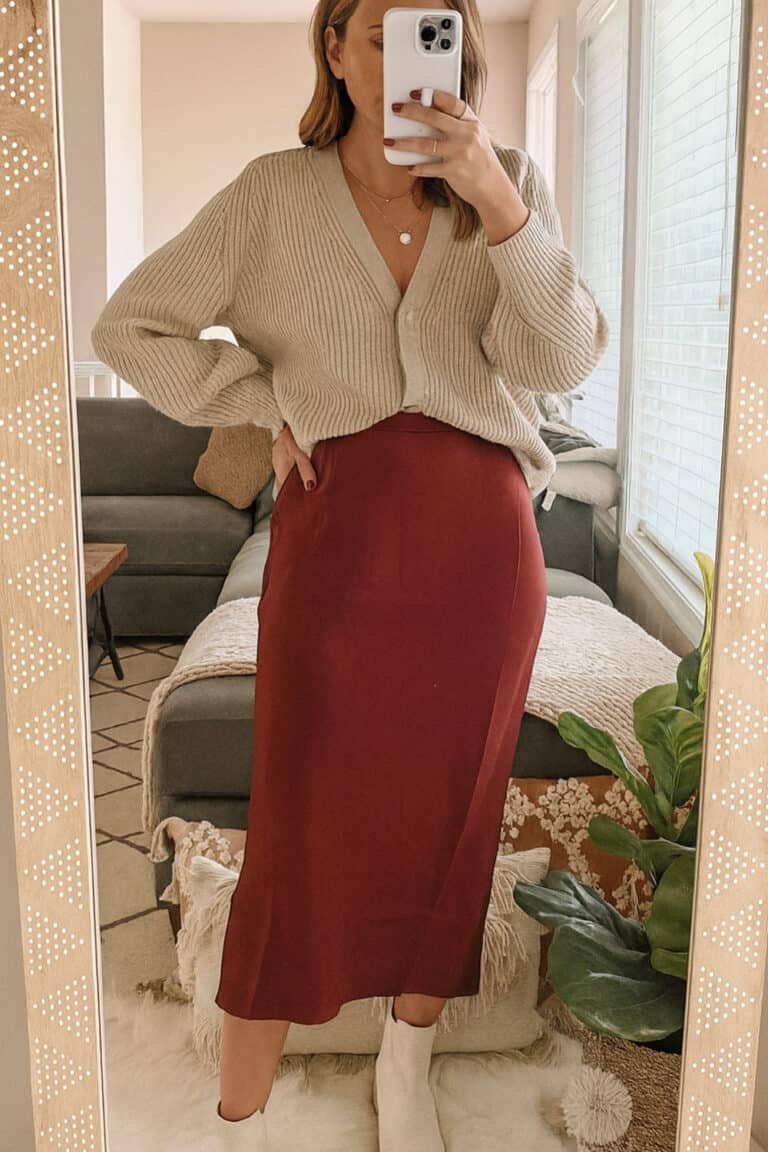 The soft beige cardigan gives total warm-and-snug energy, and pairing it with that deep rust-red satin skirt?