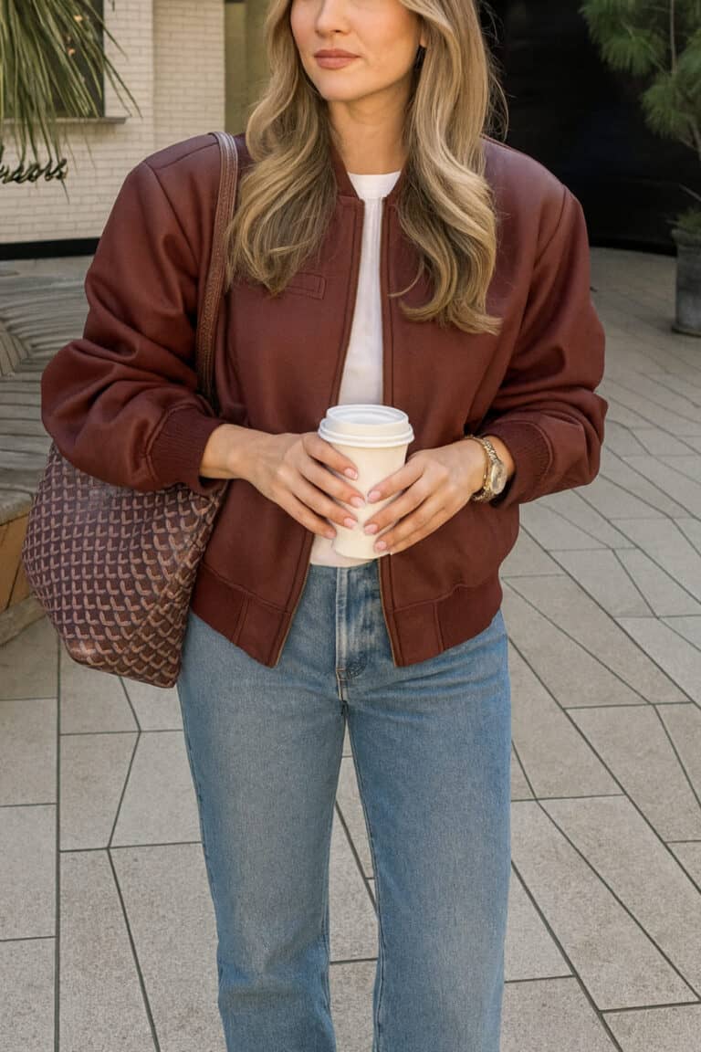The deep burgundy bomber jacket gives off that rich, elevated vibe without trying too hard, and pairing it with a crisp white tee and high-waisted denim keeps it clean and effortless.
