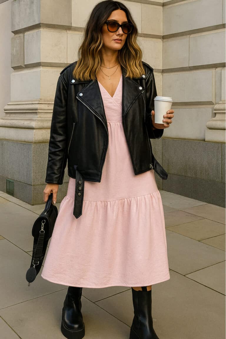The soft pink flowy dress brings all the feminine, free-spirited vibes, while the black leather jacket and chunky boots flip the script with a cool-girl twist.