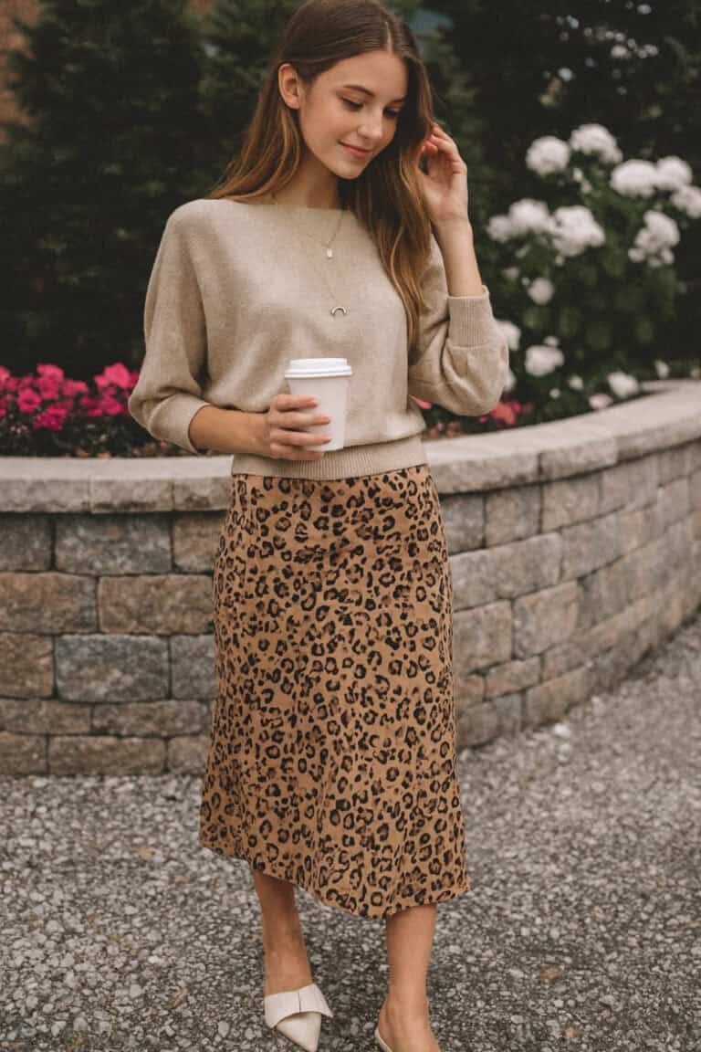 The soft beige sweater keeps things neutral and laid-back, while the leopard midi skirt brings all the fun, flirty energy.