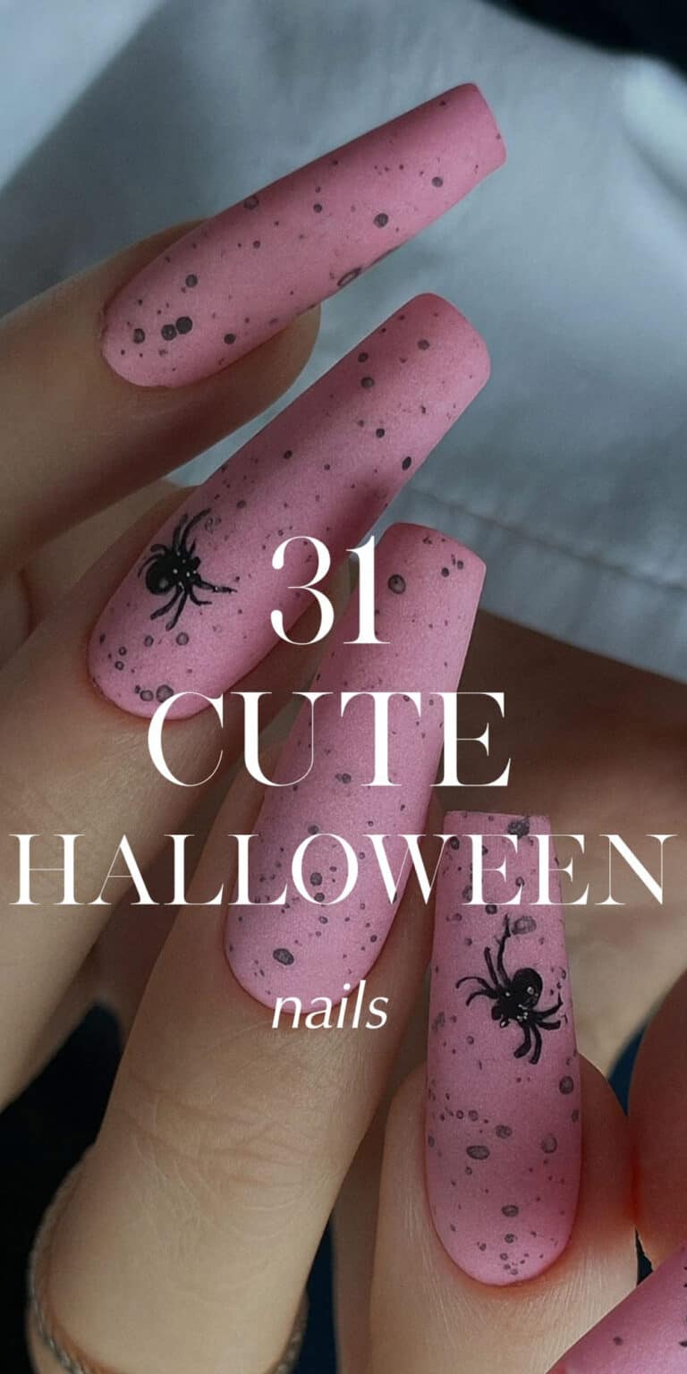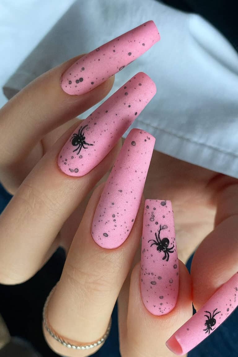 The matte pink base with black speckled detailing looks super edgy, almost like a Halloween candy vibe, and the little spider accents take it straight into creepy-cute territory.