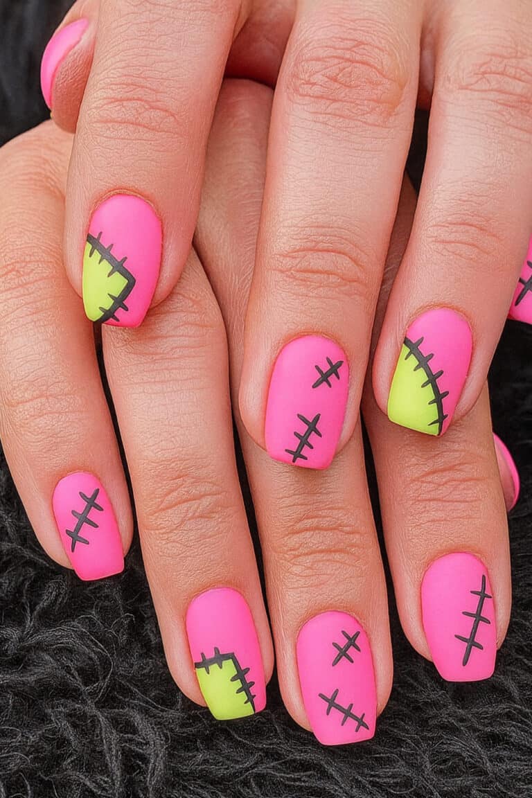 The hot pink base mixed with those pops of neon green is already a vibe, but the black stitched detailing takes it full-on spooky season.