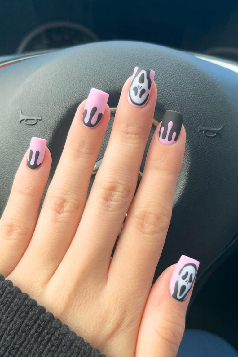 The soft pink base keeps it girly, but the black drips and Ghostface accents totally flip it into horror-core.