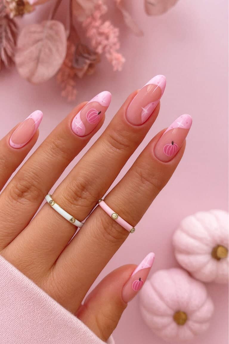 The blush pink French tips with tiny pumpkins make it super sweet, and the glossy finish with little sparkle details keeps it dreamy.