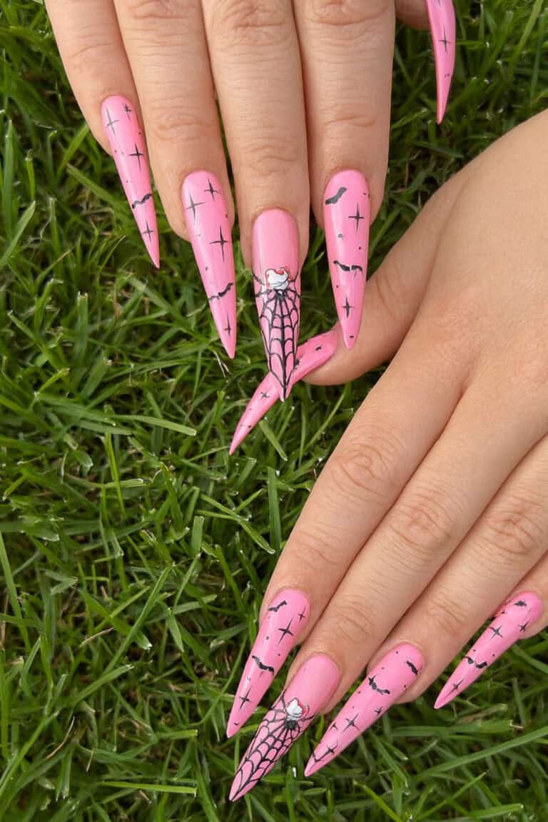 It’s playful, spooky, and a little theatrical, perfect if you want your mani to scream Halloween without losing that girly pink touch.