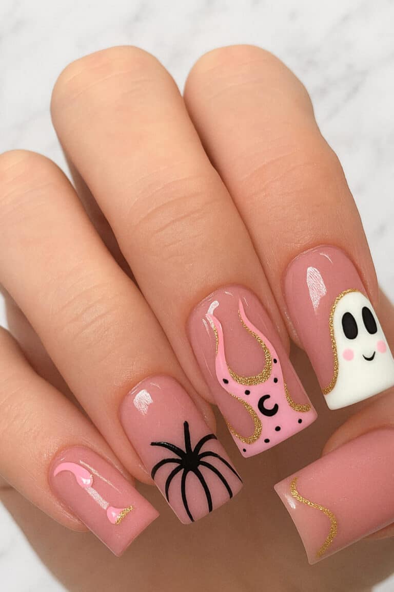 The nude-pink base makes it classy, but the details—like the black spider, gold-lined flames, crescent moon, and the cutest little ghost—make it Halloween-ready.