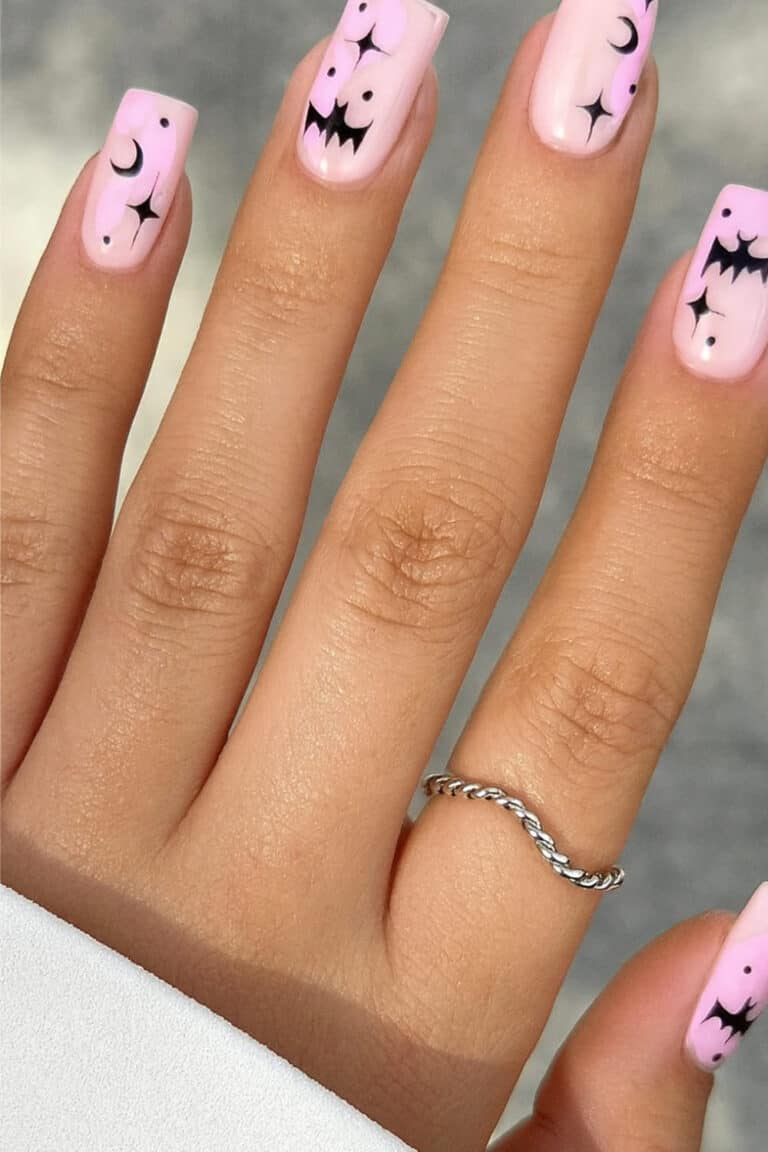 The light pink base keeps it super cute, while the tiny black bats, moons, and star sparkles add just enough Halloween energy.