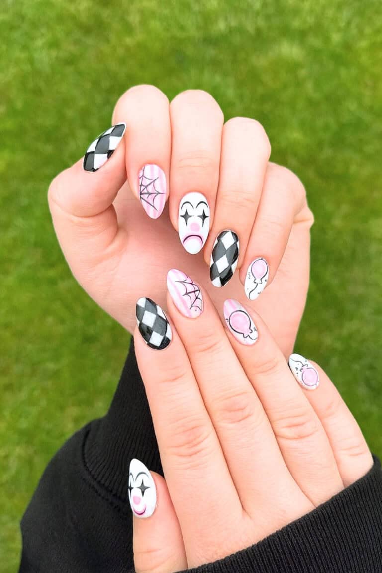 You’ve got the bold black-and-white harlequin diamonds, spooky spiderwebs, and then those dramatic clown faces with pink cheeks and sad expressions—super creepy but cute.