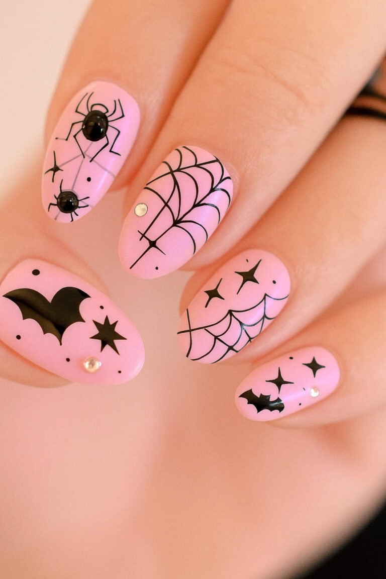 The bubblegum pink base makes it cute, but then you’ve got the black spiderwebs, bats, and sparkly star vibes that flip it into spooky season real quick.