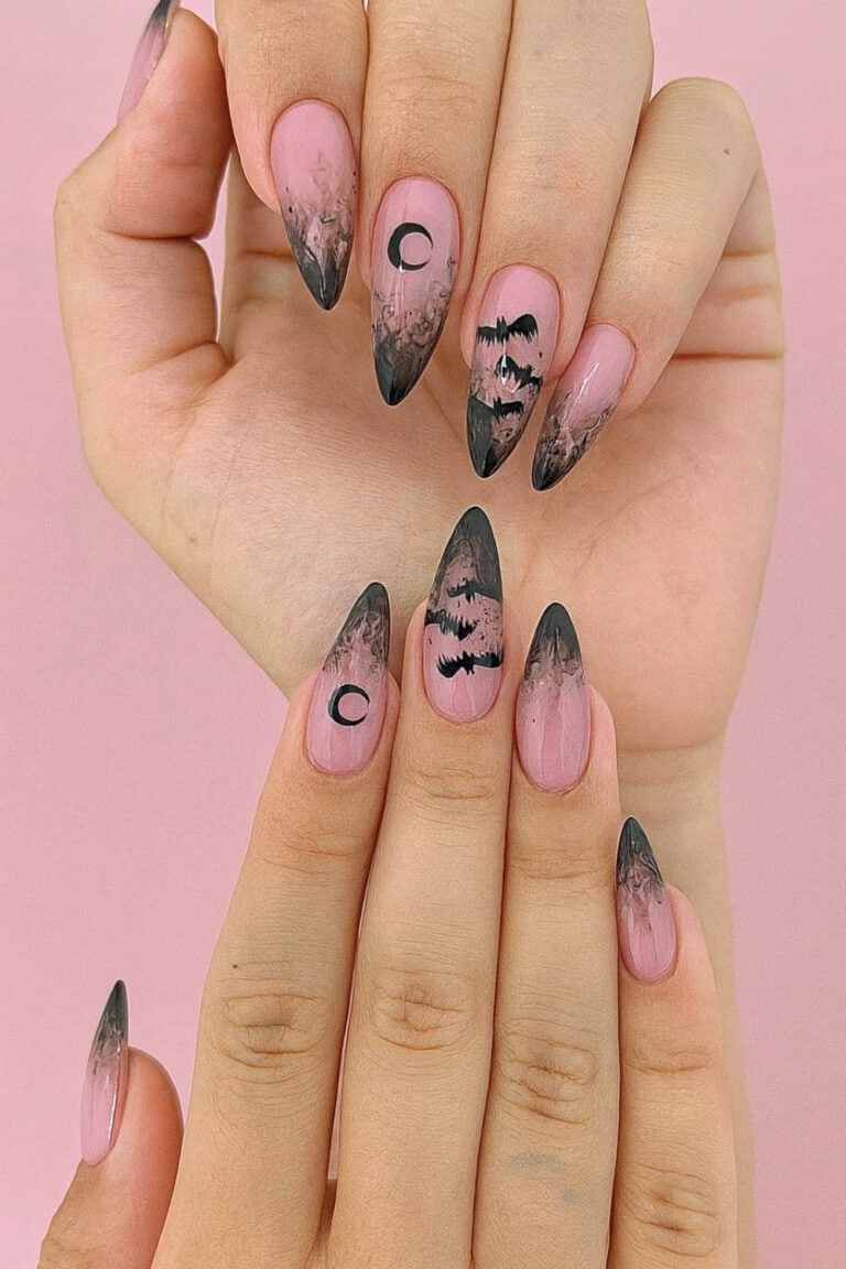 Add in the crescent moons and flying bats, and it’s basically a whole Halloween night sky on your nails. Dark, chic, and spooky but still girly—total statement set.
