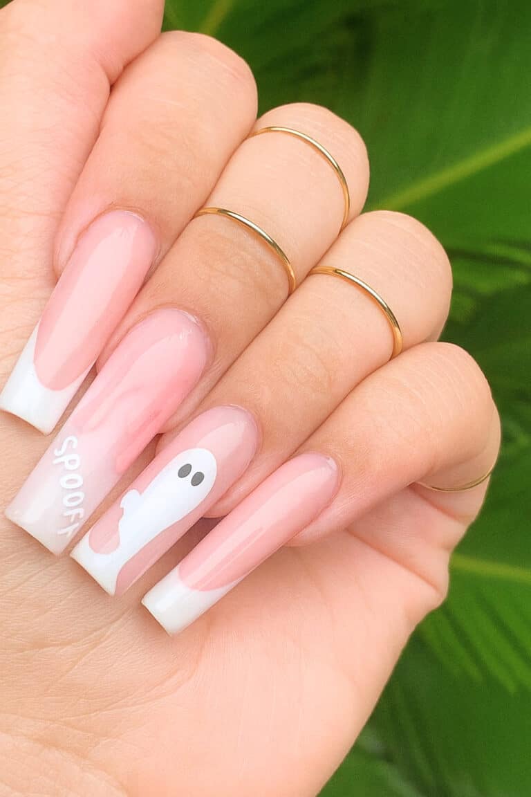 The long pink-and-white French tips look super clean, but then you’ve got that little ghost and the “SPOOF” text that makes it playful and Halloween-y.