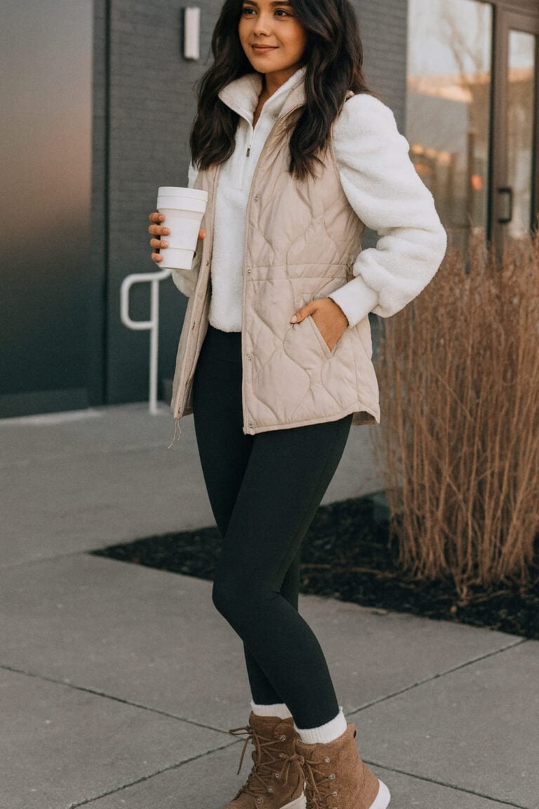 The quilted vest layered over the soft fleece gives total warm-girl energy, while the black leggings keep it sleek and simple.