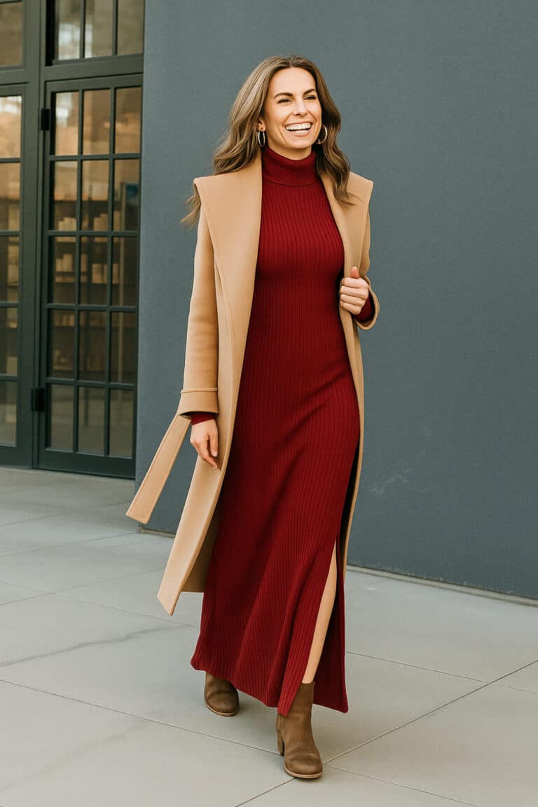 The long ribbed burgundy dress paired with the camel coat feels effortlessly chic while the neutral boots keep the outfit grounded and balanced.