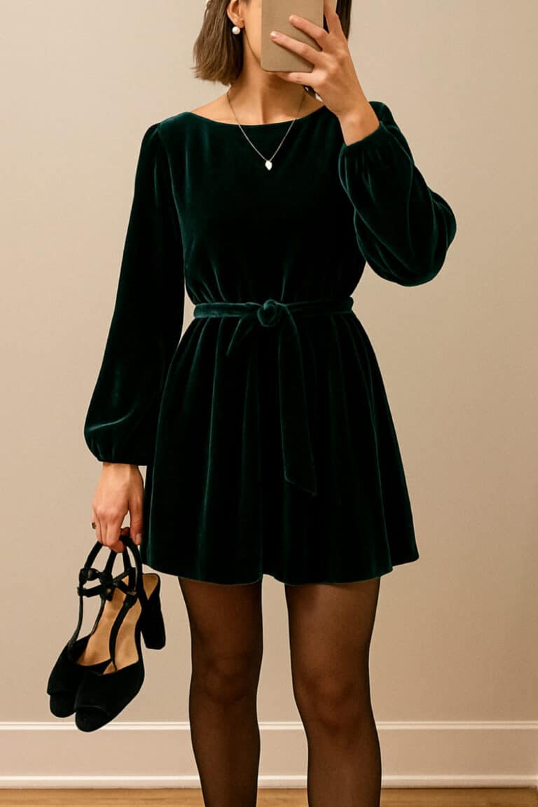 Velvet is the moment every winter. It’s rich, soft, and instantly classy. Pair a velvet mini dress (deep red, emerald green, or navy) with sheer black tights and ankle boots.