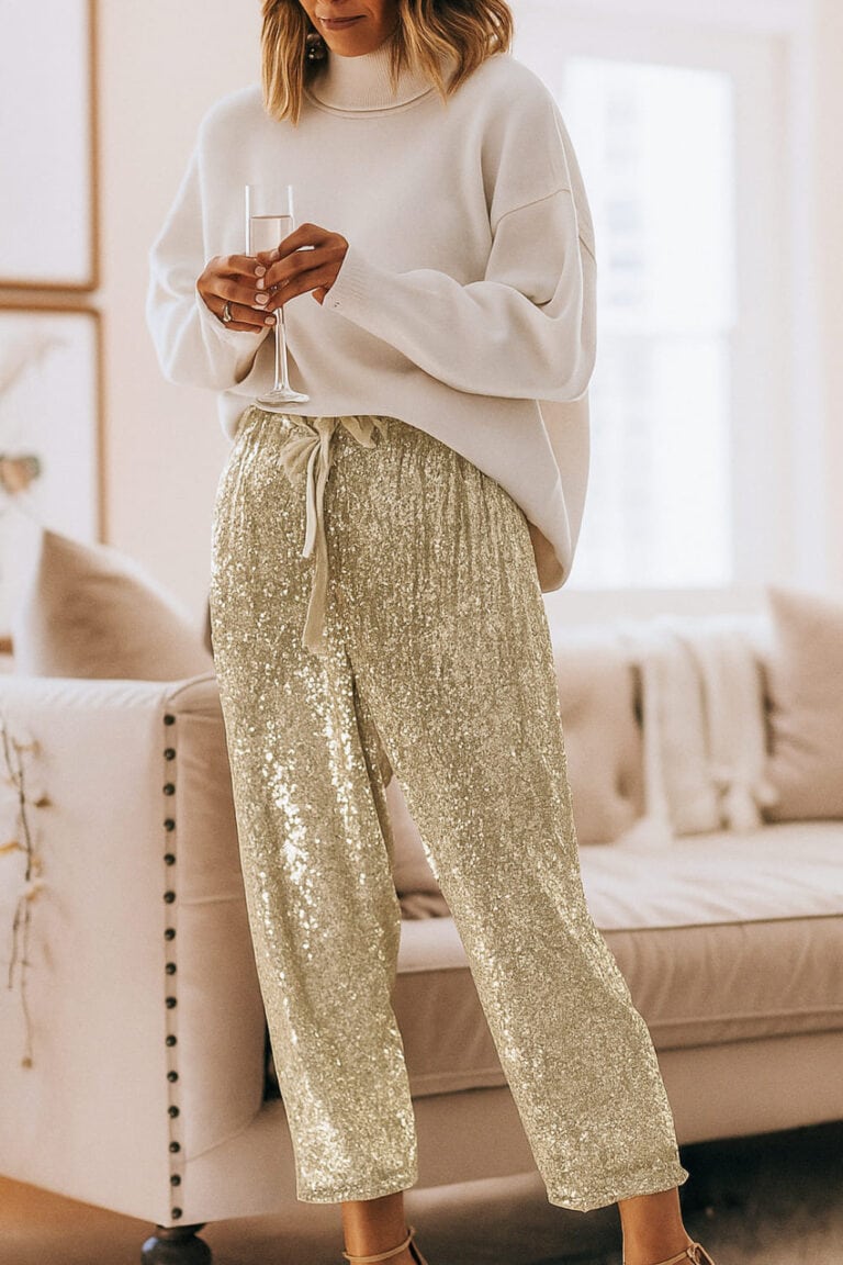 If dresses aren’t your thing, sequin pants deserve a moment. They’re fun, flashy, and way comfier than they look.